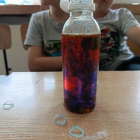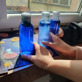 - „kosmos w słoiku” z wykorzystaniem waty i kolorowych barwników,